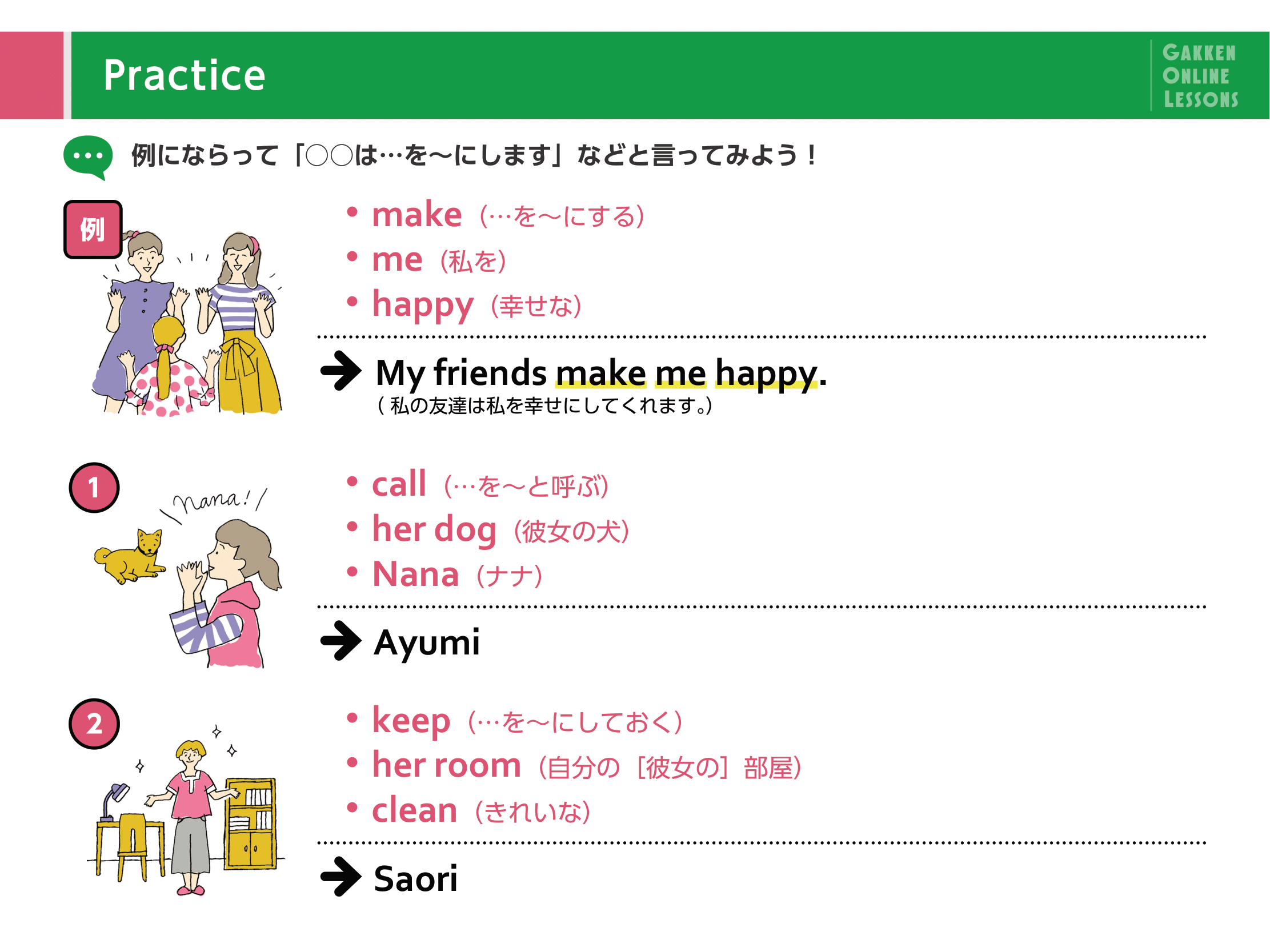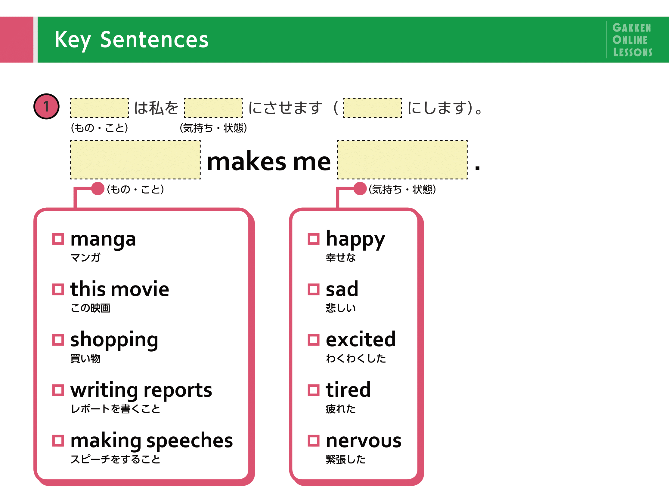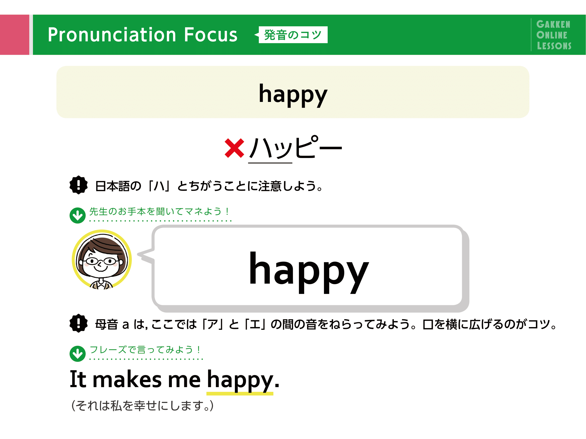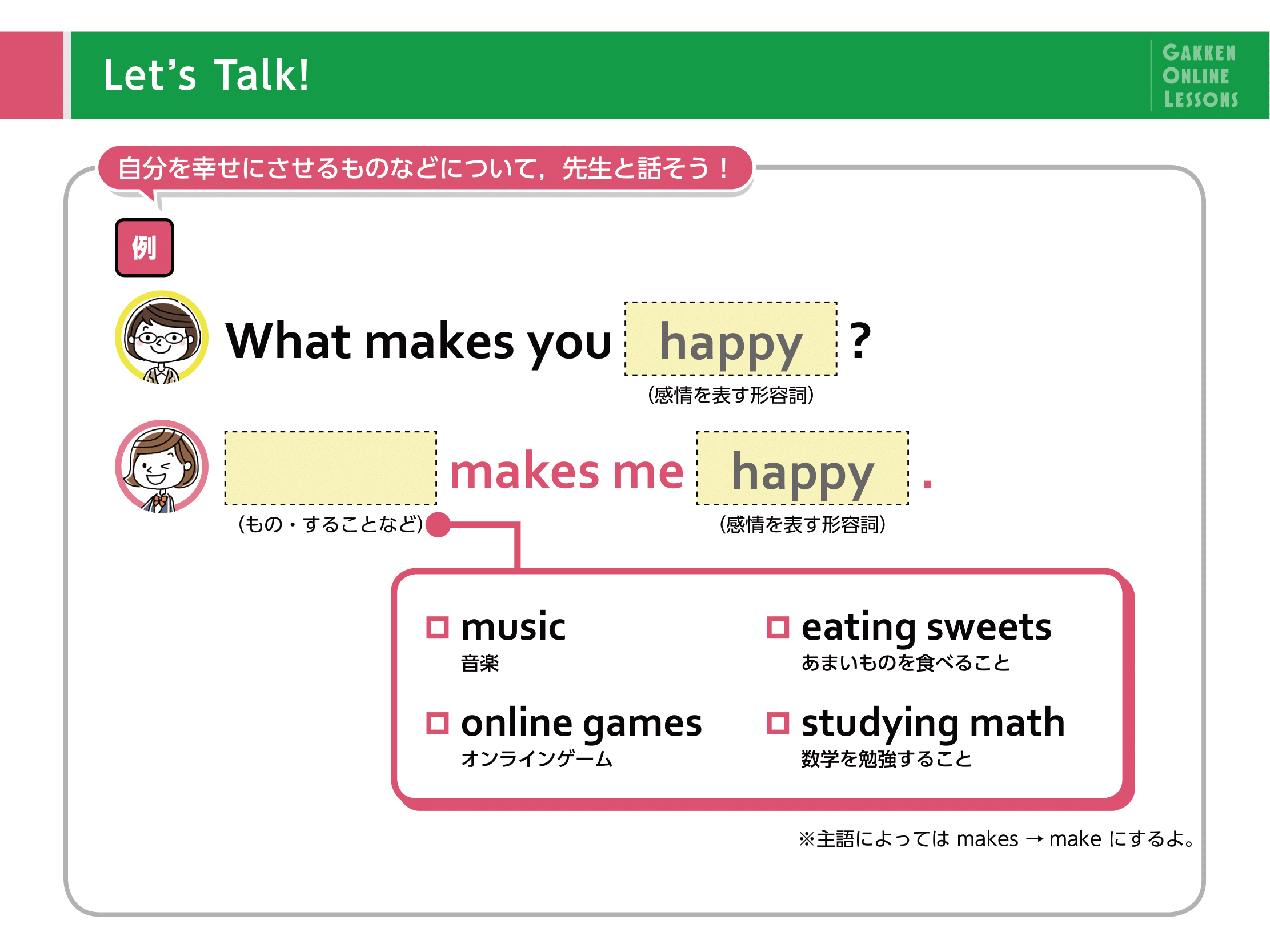 Lesson 1 幸せにしてくれるものなどを伝えよう一般動詞 make を使った文を学習します。「それは私を幸せにします」「買い物は私たちをわくわくさせます」のように、物事や人によって「〜させる、させられた」といった表現を会話の中で使えるようになります。