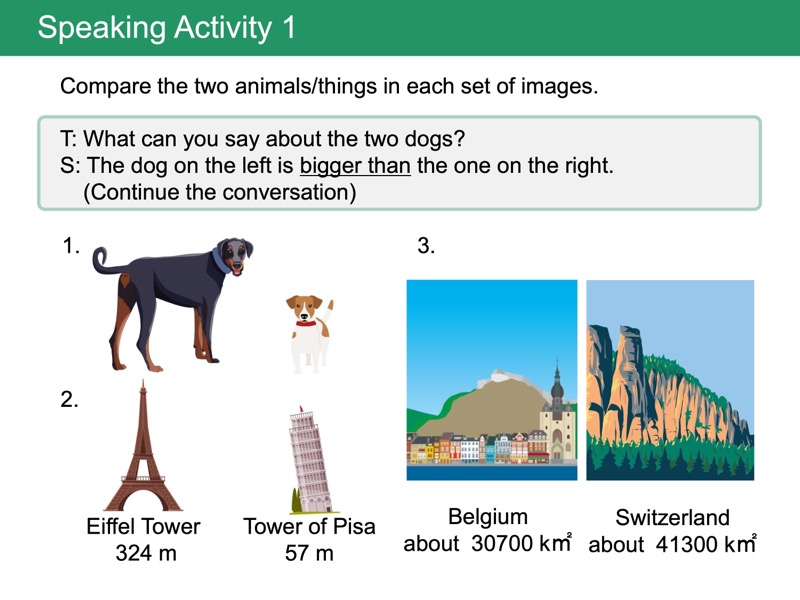 Lesson 1 形容詞の比較級(-er型)「それは〜より大きいです」のように、2つの物または人の様子などを比べた文を言えるようになります。