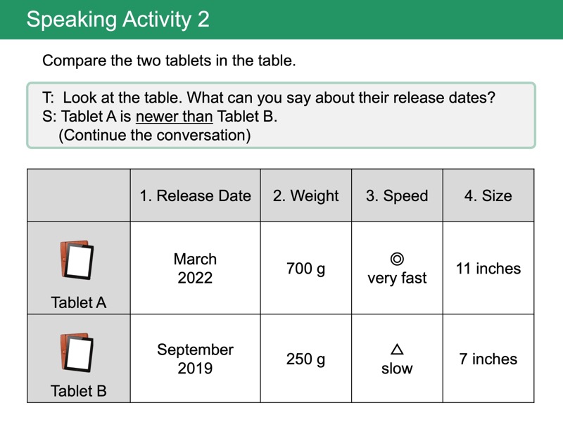 Lesson 5 形容詞の比較級 yes/no疑問文「〜は〜より軽いですか」「〜は〜より若いですか」のように、2つの物や人を比べてそれらについてたずねることができるようになります。