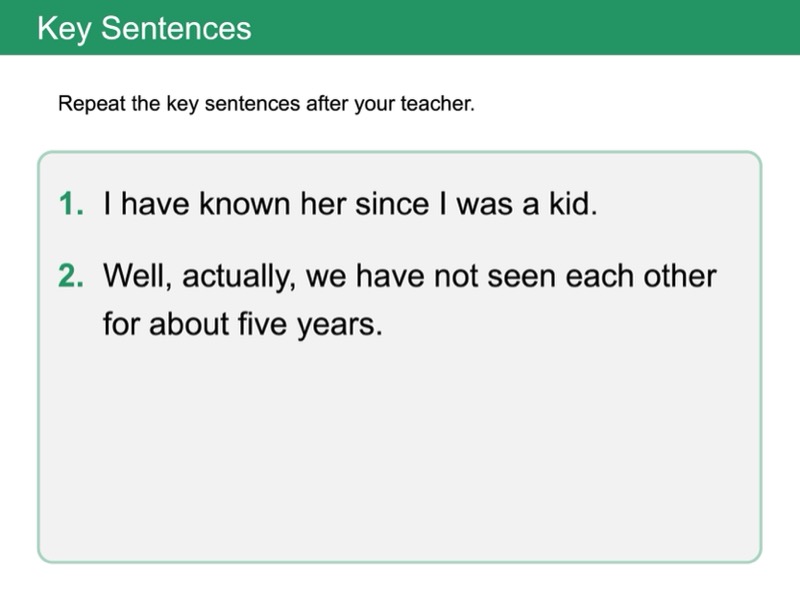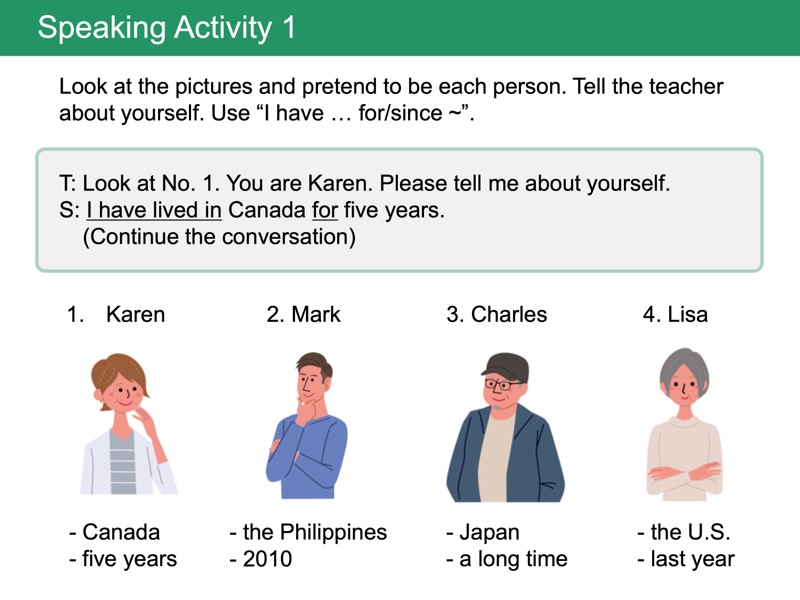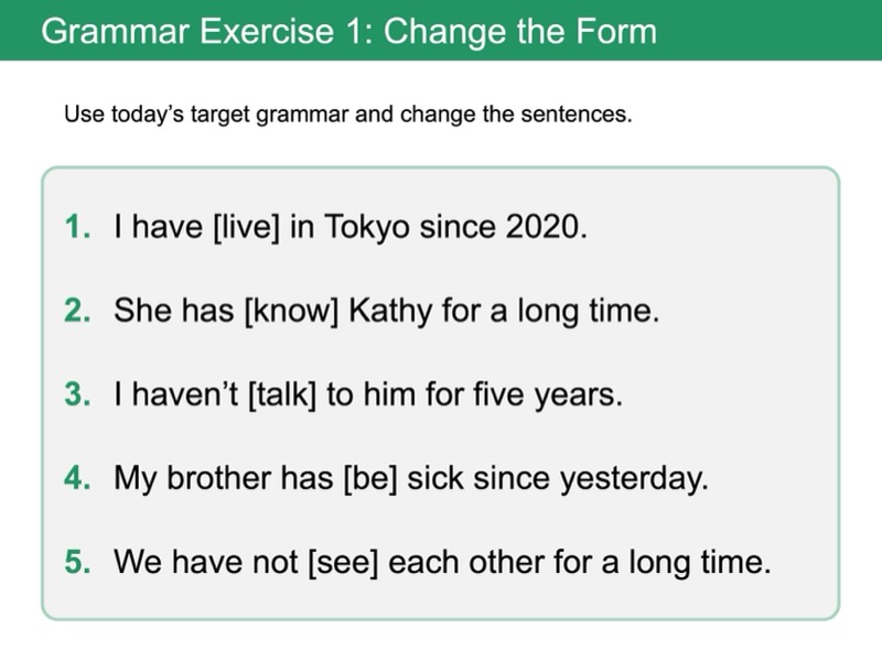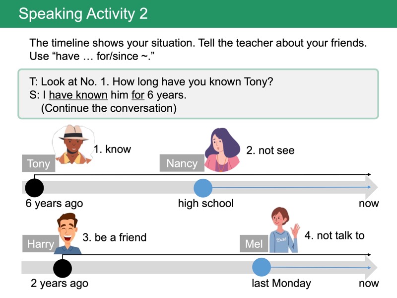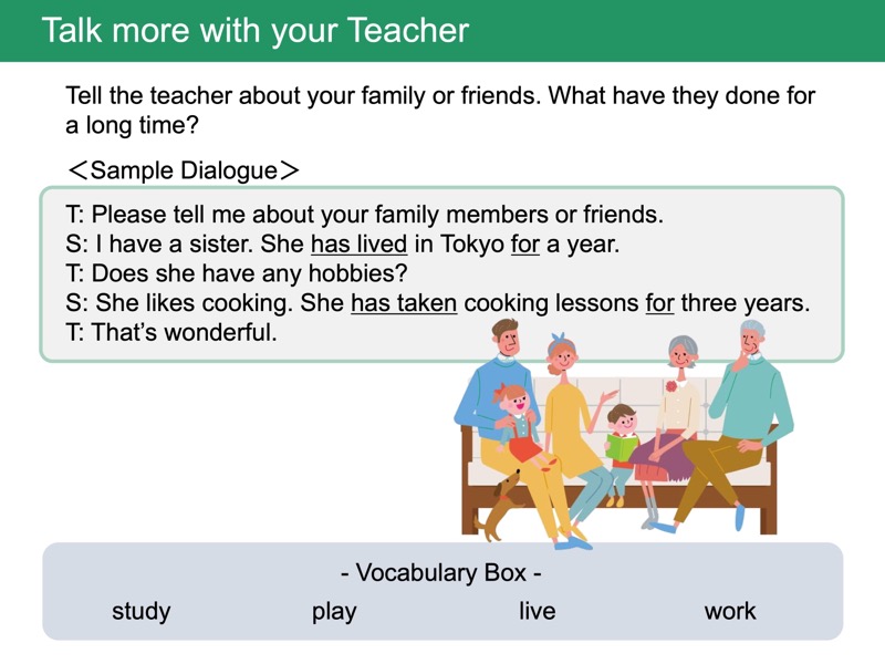 Lesson 3 現在完了形と for, since(継続)「4年間ずっと~しています」「幼い頃からずっと~しています」のように、どのくらいの期間、物事を継続しているかについて伝えられるようになります。
