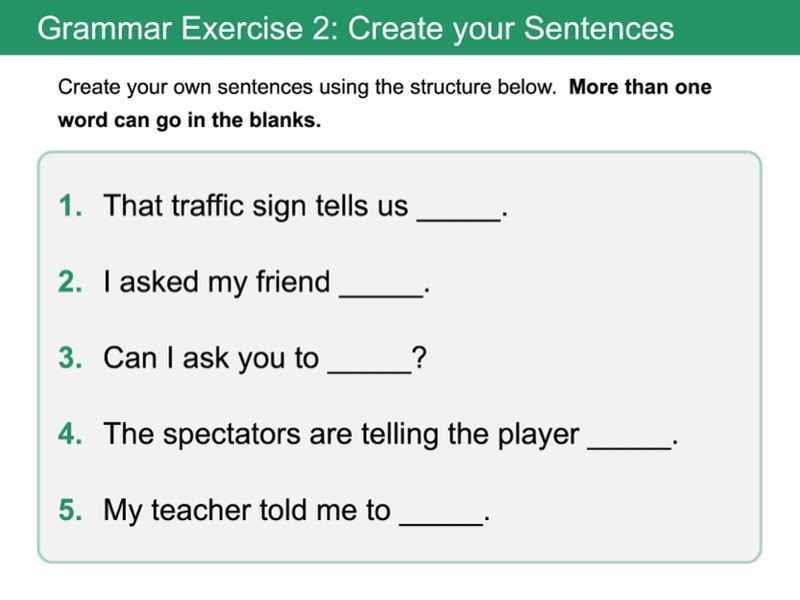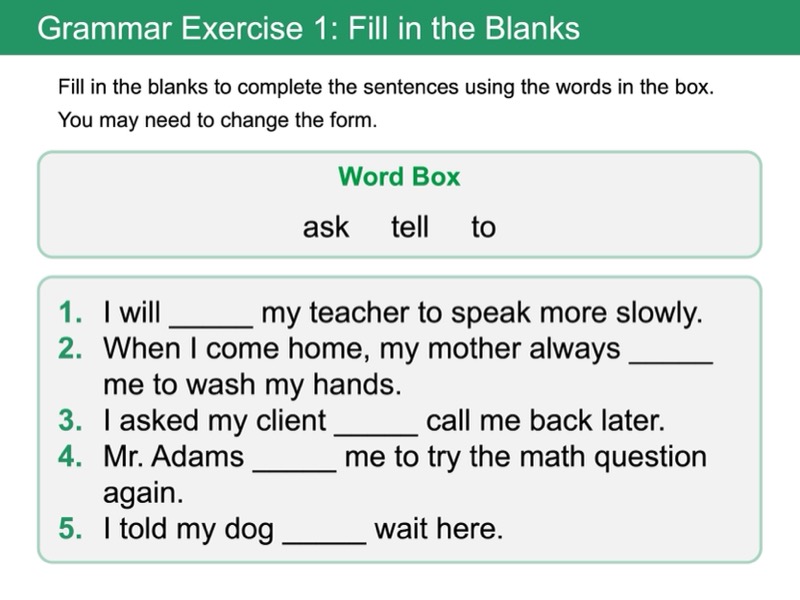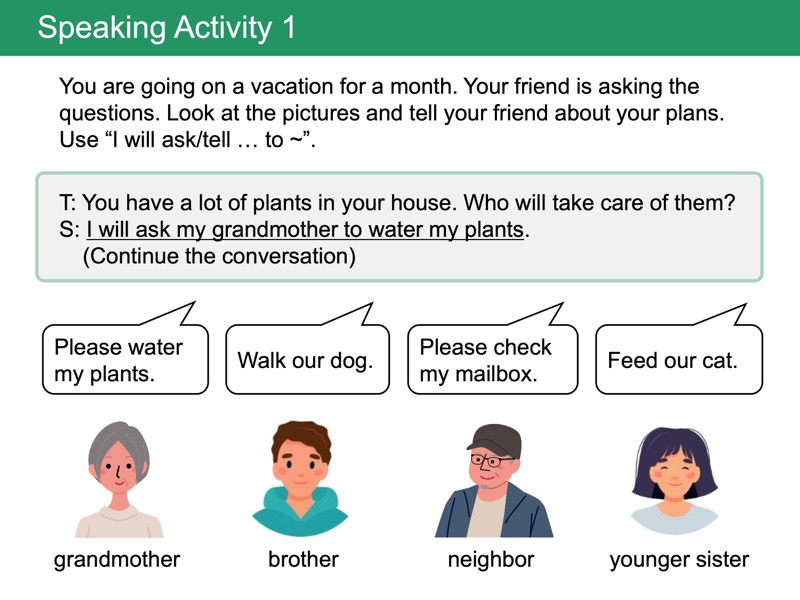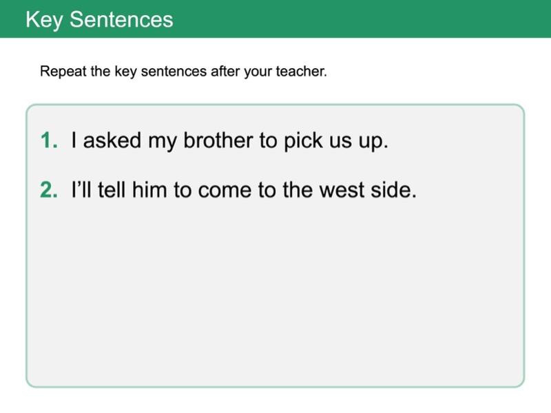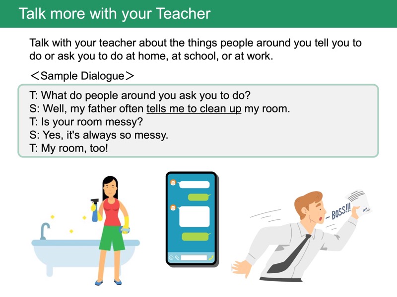 Lesson 1 ask, tellを使ったto不定詞の文「(人に)~するように頼む」「(人に)~するように言う」といった、誰かに依頼したり伝えたりすることについて話せるようになります。