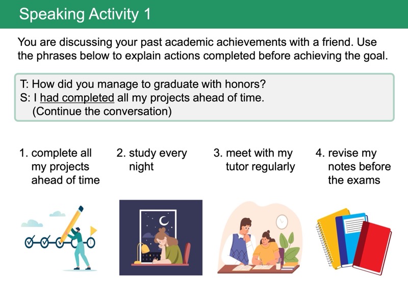 - 今まさにされていることや、過去にされていたことについて伝えられるようになる