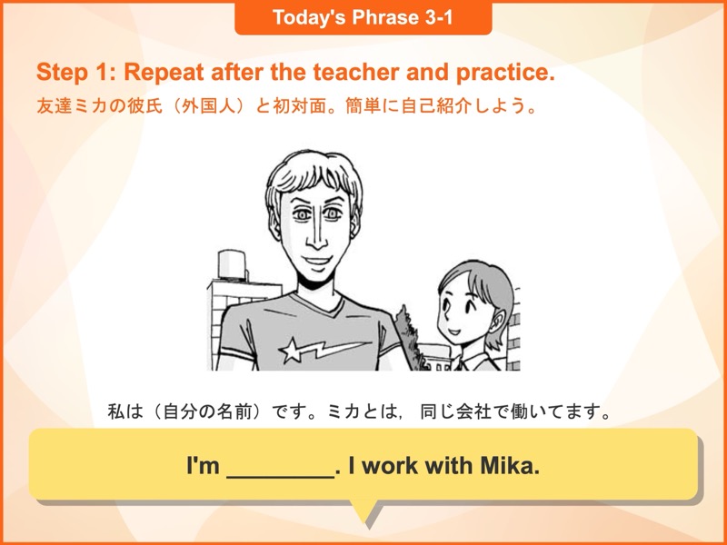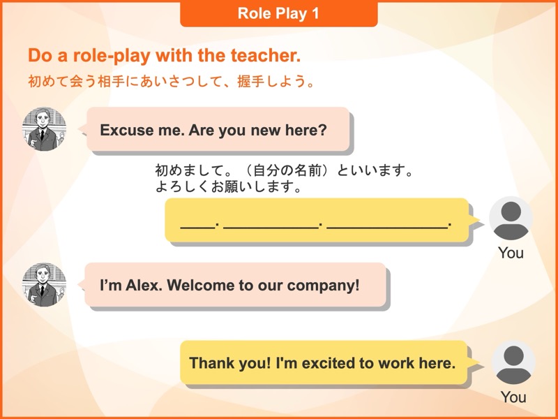 日常生活でよくあるシチュエーションに適した使用頻度の高いフレーズや表現方法を学び、瞬間的に発話できるよう、段階を踏んでトレーニングを行います。何も見ないでフレーズが言えるようになった後は、そのフレーズをロールプレイの中で使ってみます。会話の中でどんなふうに使うのかをイメージしながら練習することで、実践力がより身に付きます。