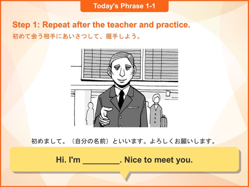 Lesson 1 初対面(1)初めて会う相手とのあいさつや、別れるときのフレーズを学びます。