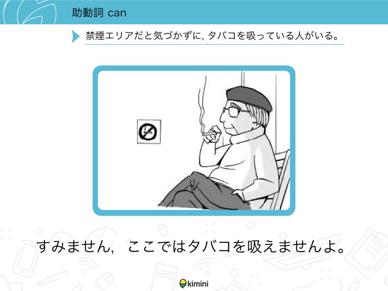 講師がイラストのシチュエーションの説明を2回繰り返し、そのシチュエーションに適したフレーズを一緒に練習します。イラストによっては、カジュアルな言い方やフォーマルな言い方、その他の役立つフレーズも講師が紹介します。