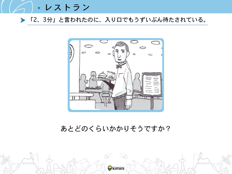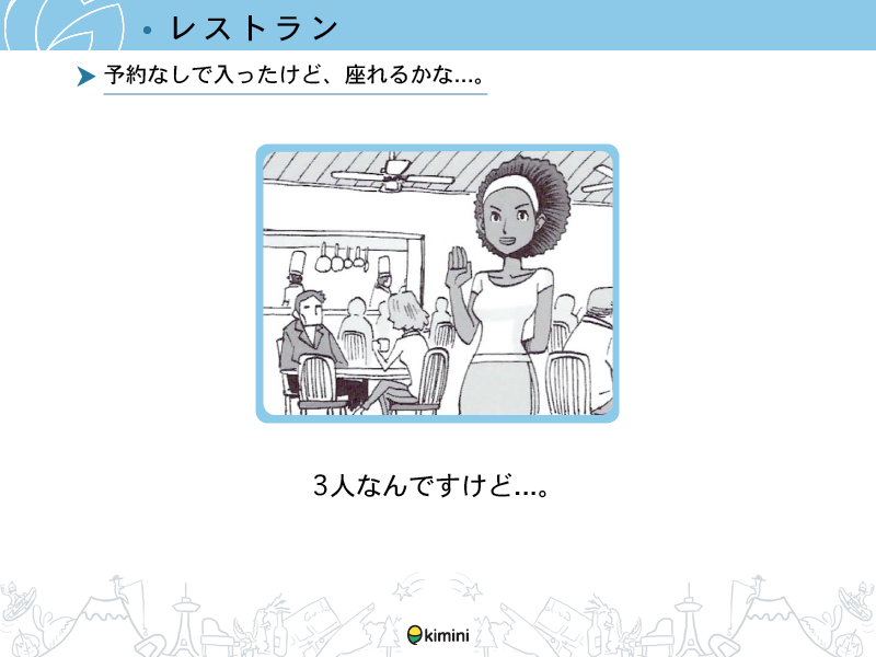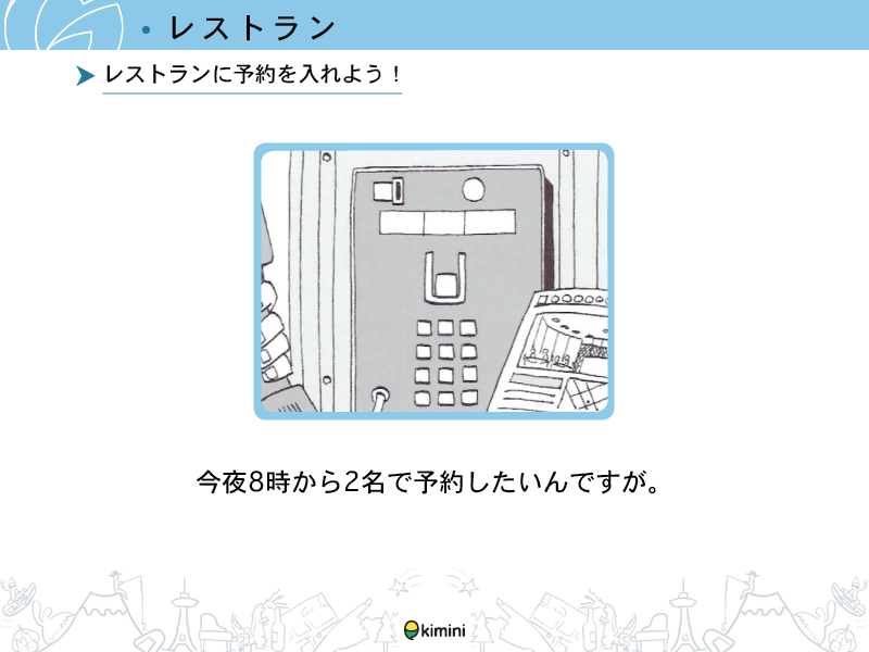 レストランのウェイターさんとの注文や会計などのやりとりを学びます。