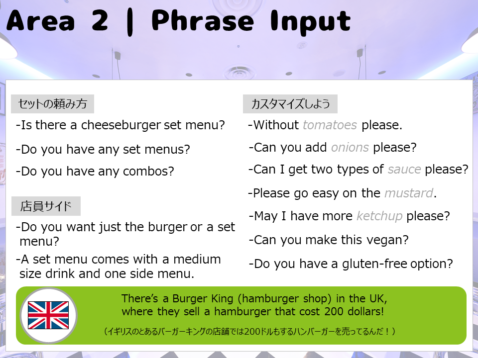 • <エリア>薬局/スーパーマーケット/ファストフード/レストラン/カフェ/旅行代理店/ホテル/クリニック/機内/おみやげ売り場/学生課/本屋