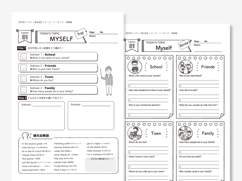各レッスンには、予習・復習教材が準備してあります。レッスン前には事前に話したいトピックを選び、会話に役立つ表現などを学習しておくことができます。また、レッスン後には、各トピックについて自分が話したことや、講師からもらたアドバイスを整理することで、学習した内容をしっかりと定着させることができます。