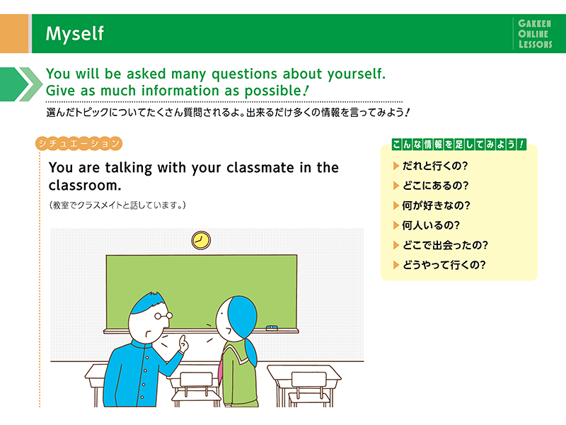 聞かれたことに対して「はい」「いいえ」と答えるだけでなく、その理由や付加情報などを加えて答える練習をします。