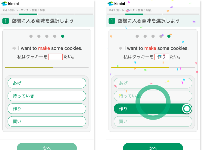 語彙現在の学習指導要領では、小学生では600-700、中学生では1600-1800、高校生では1,800-2,500の語彙数が必要に。語彙トレーニングでは、使用頻度の高い順に4,400語以上収録しており、音声で入力することもできるので、しっかりアウトプットも強化できます。