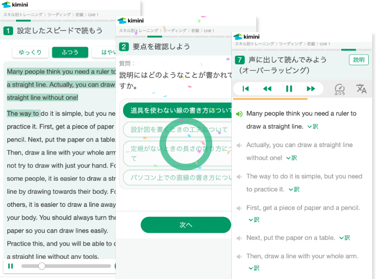 リーディング読み上げスピードを設定した上でパッセージを読み、概要の確認をします。その後、自分のペースで読んで理解度を確認する問題に取り組みます。1文ずつ確認し、リピーティングやオーバーラッピングの練習を通して、アウトプットの練習にも繋げます。