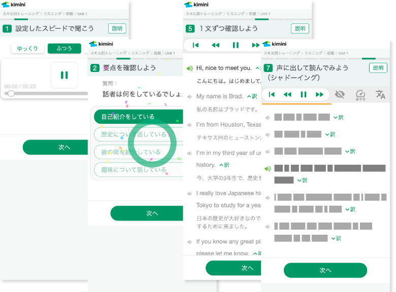 一文一文音声や意味を確認し、音声スクリプトの内容を理解した後は、実際に自分でも口から出して言えるようにシャドーイングの練習を行います。