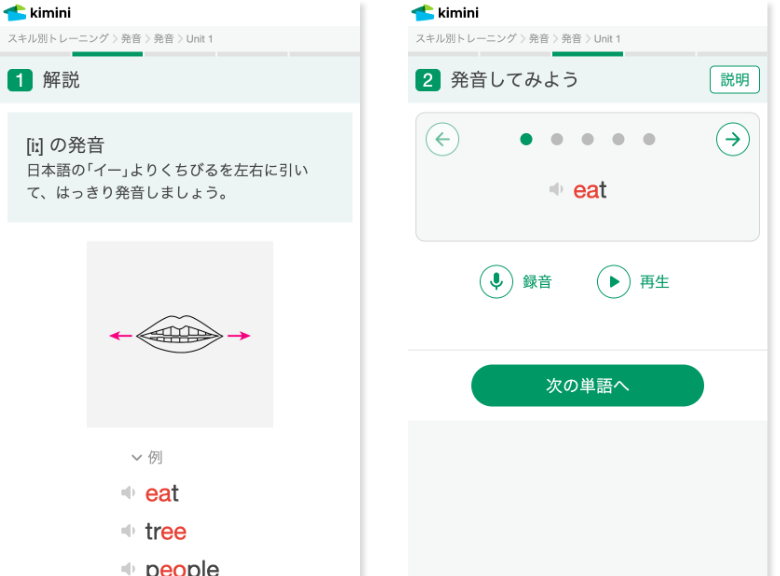 発音発音はスピーキング力を向上させるだけでなく、リスニング力を鍛えるのにも重要です。このトレーニングでは、音素ごとの口の形や舌の位置、発音のポイントを学びながら、自身の発音を録音して確認することができます。また、より自然な発音を目指すために重要な音法のユニットも収録されています。