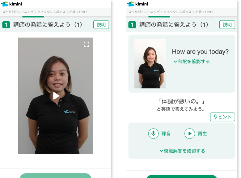 クイックレスポンスクイックレスポンスの練習では、講師のショート動画に対して、与えられた日本語訳をすぐに英訳し音声で回答することで、英語での瞬発力を鍛えます。実際の会話を想定して何度も繰り返し練習することにより、使えるフレーズを増やすことができます。