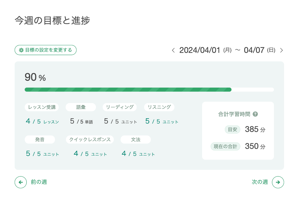 また、学習サイト内の今週の目標と進捗ページでは、週の学習目標の設定と学習の進捗が確認ができます。自身の学習状況を可視化することで、継続した自己学習を促し、英語の基礎力を強化します。